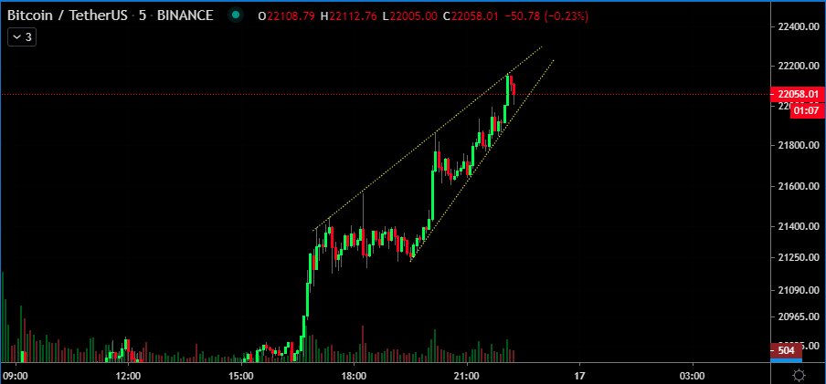 Bitcoin forms the Rising Wedge pattern on a 5-minute chart. Source: BTCUSDT on TradingView.com